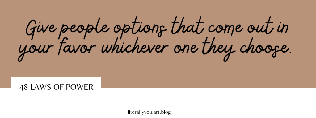The best deceptions are the ones that seem to give the other person a choice: Your victims feel they are in control, but are actually your puppets. Give people options that come out in your favor whichever one they choose. Forte them to make choices between the lesser of two evils, both of which serve your purpose. Put them on the horns of a dilemma: They are gored wherever they turn.